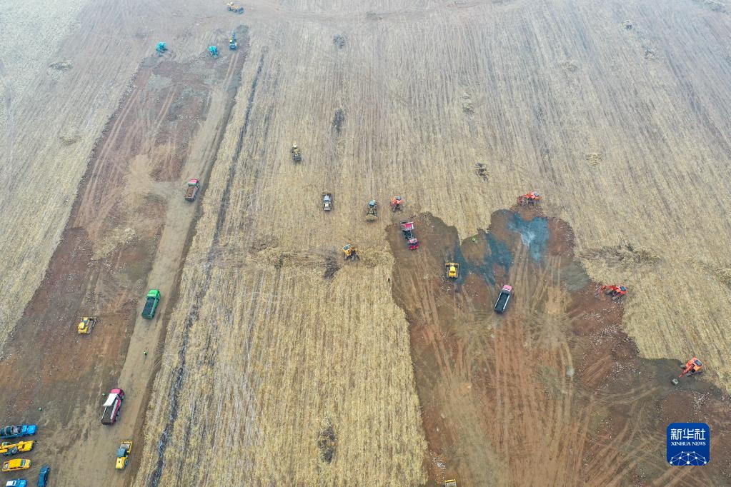 工程機械在吉林市高新南區隔離方艙現場(chǎng)施工(3月13日攝,無(wú)人機照片)。新華社記者 張楠 攝