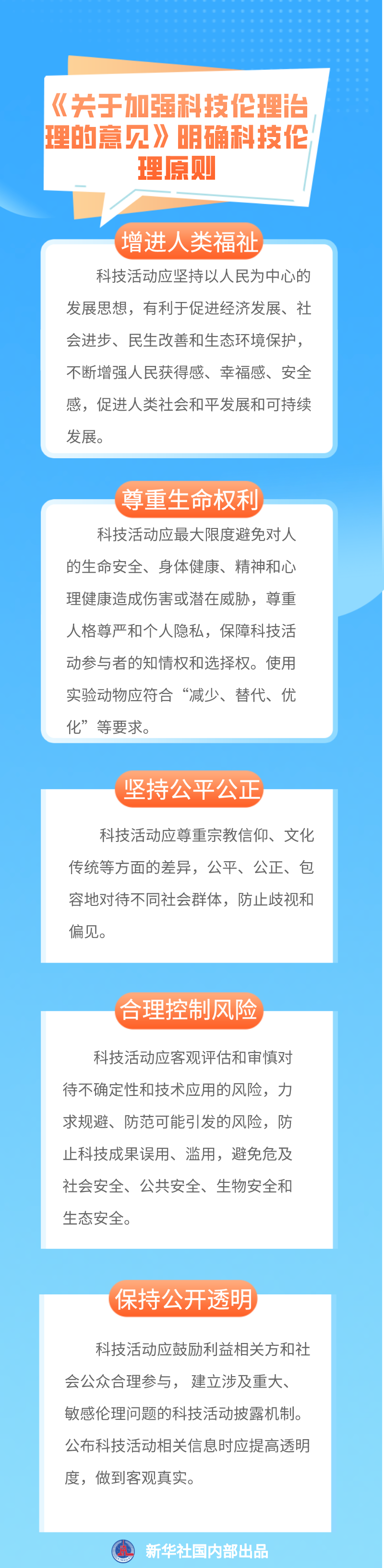 科技部副部長(cháng)相里斌在23日召開(kāi)的《關(guān)于加強科技倫理治理的意見(jiàn)》新聞發(fā)布會(huì )上介紹:“意見(jiàn)起草過(guò)程中,我們著(zhù)重把握了以下幾個(gè)方面,一是確立價(jià)值理念,彰顯我國對加強科技倫理治理的立場(chǎng)和態(tài)度;二是突出問(wèn)題導向,著(zhù)力解決我國科技倫理治理體制機制不健全、制度不完善、領(lǐng)域發(fā)展不均衡等問(wèn)題;三是強化系統部署,提出加強科技倫理治理的重大舉措?!?/p>
