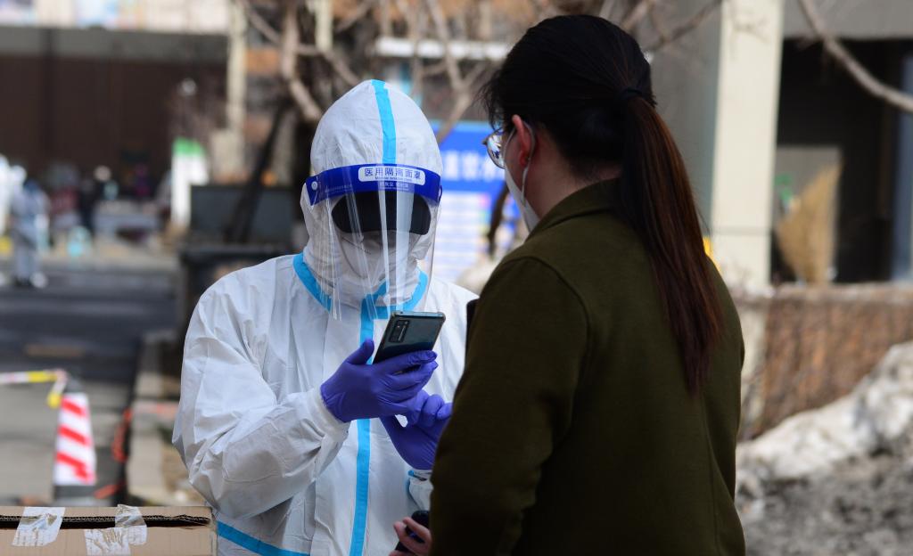 3月24日,在長(cháng)春市南關(guān)區一處核酸檢測點(diǎn),居民掃碼登記信息。新華社記者 張建 攝