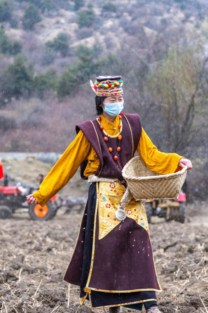 村民仁增旺姆是當天春耕活動(dòng)的主角,負責引領(lǐng)春耕隊伍前行。盡管田間泥濘,但她著(zhù)裝華麗。