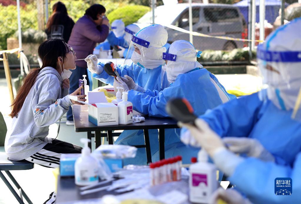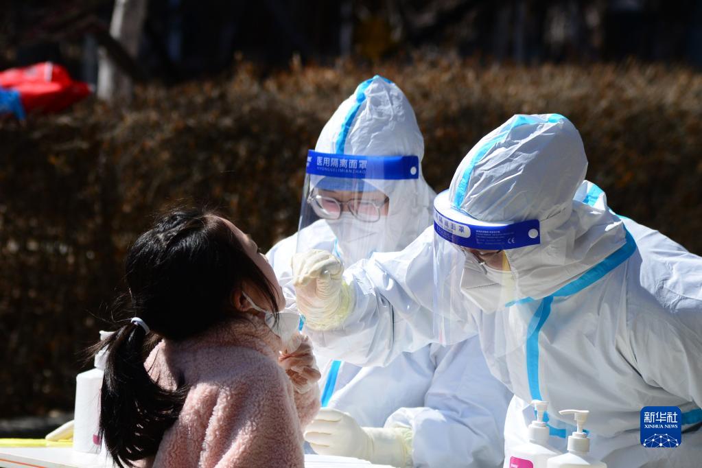 4月7日,在長(cháng)春市南關(guān)區一處核酸檢測點(diǎn),醫務(wù)人員為居民進(jìn)行核酸采樣。新華社記者 張建 攝