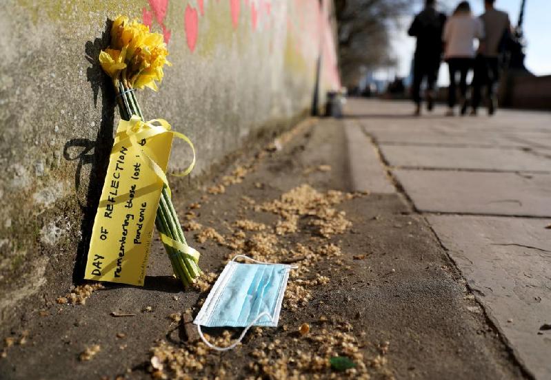 這是3月27日在英國倫敦國家新冠紀念墻邊拍攝的花束和口罩?;ㄊ缘淖謼l上寫(xiě)著(zhù)“紀念在疫情中失去生命的人們”。新華社記者李穎攝