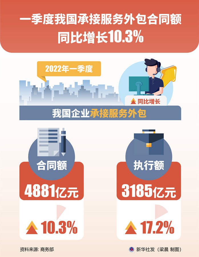 新華社北京4月14日電(記者謝?,帲┥虅?wù)部新聞發(fā)言人束玨婷14日介紹,今年一季度,我國企業(yè)承接服務(wù)外包合同額4881億元,執行額3185億元,同比分別增長(cháng)10.3%和17.2%。