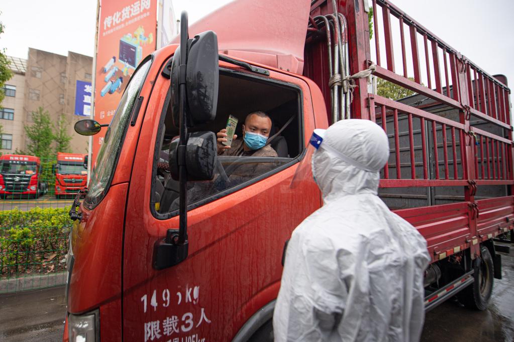4月13日,工作人員查驗駛入杭州傳化公路港的貨車(chē)司機健康碼。 新華社記者 江漢 攝