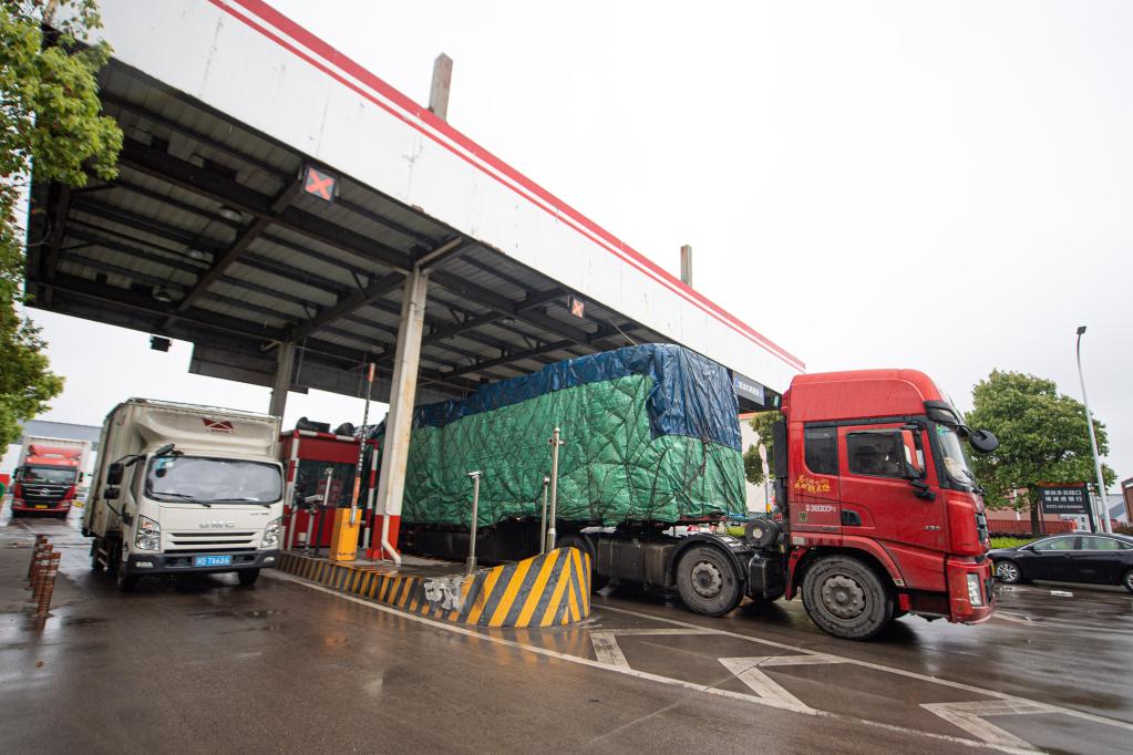 4月13日,車(chē)輛進(jìn)出杭州傳化公路港。 新華社記者 江漢 攝