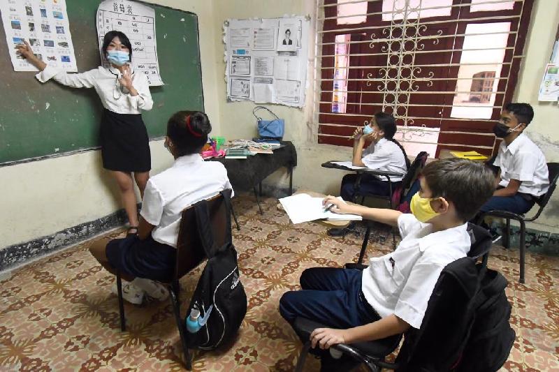 3月7日,中國教師侯嘉琪(左一)在古巴首都哈瓦那的羅德里格斯中學(xué)為學(xué)生上中文課。新華社發(fā)(華金·埃爾南德斯 攝)