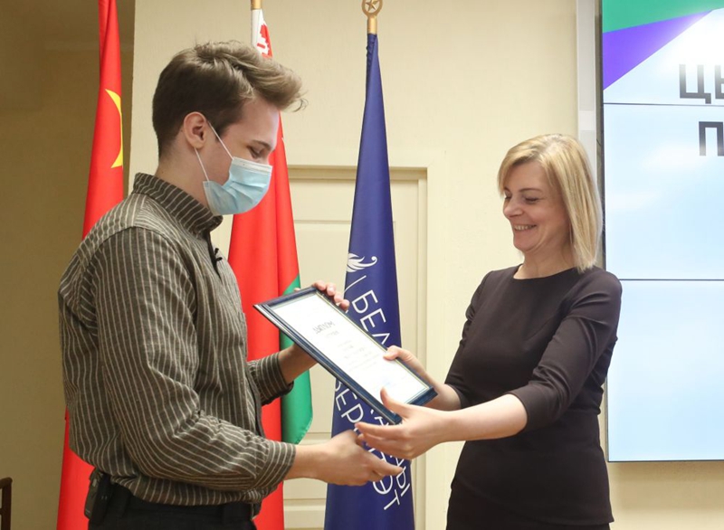 2021年3月5日,白俄羅斯教育部第一副部長(cháng)斯塔羅沃伊托娃(右)在明斯克向第四屆白俄羅斯大學(xué)生奧林匹克中文競賽第一名獲得者頒發(fā)證書(shū)。新華社發(fā)(任科夫攝)