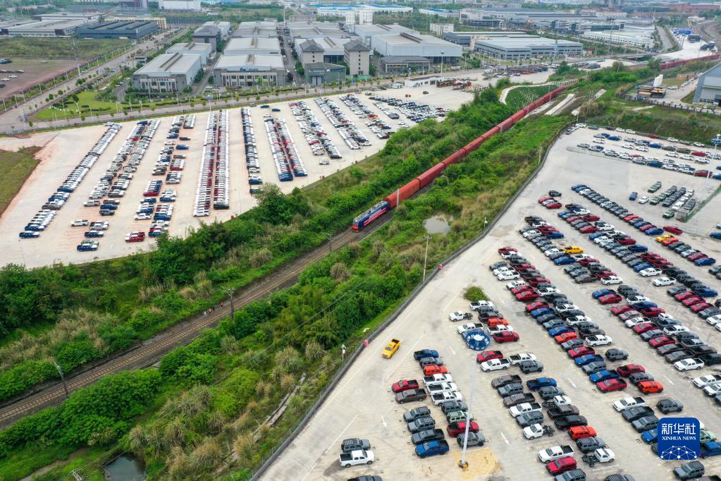 4月14日,長(cháng)城汽車(chē)專(zhuān)列首發(fā)列車(chē)行駛在重慶永川國家高新區鐵路專(zhuān)用線(xiàn)上(無(wú)人機照片)。新華社記者 唐奕 攝