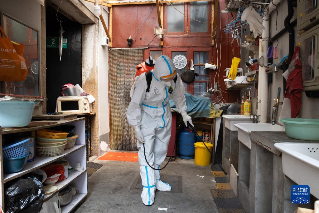 工作人員在黃浦區豫園街道廣福居民區消殺通道(4月19日攝)。新華社記者 金立旺 攝