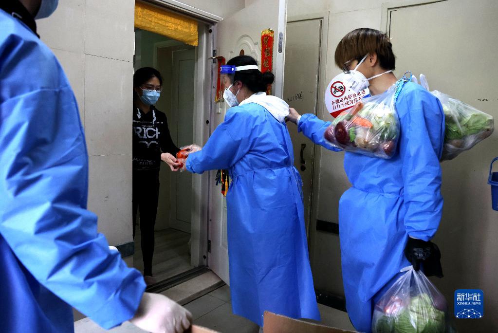 在上海市普陀區錦綠新城,社區志愿者為居民挨家挨戶(hù)運送生活物資(4月11日攝)。新華社記者 陳飛 攝