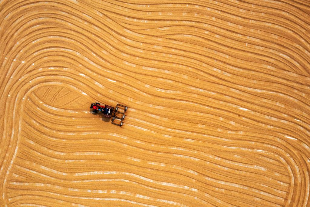 6月21日,山東省煙臺市蓬萊區新港街道大皂許家村農民駕駛農機在場(chǎng)院里翻曬小麥。(無(wú)人機照片,新華社發(fā) 于良意 攝)