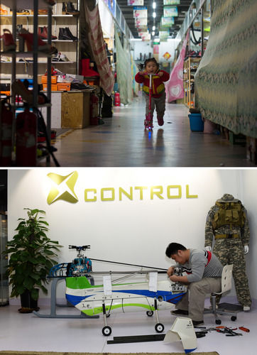 拼版照片:上圖為一名小朋友在地處北京動(dòng)物園附近的空蕩的天皓成服裝批發(fā)市場(chǎng)玩耍(2015年1月12日攝);下圖為一家無(wú)人機開(kāi)發(fā)企業(yè)的工作人員在由天皓成服裝批發(fā)市場(chǎng)轉型的寶藍金融創(chuàng )新中心工作(2018年4月3日攝)。新華社記者羅曉光攝