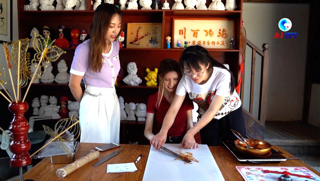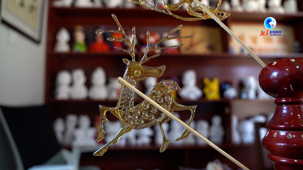 在店里,新華社記者與安吉麗娜現場(chǎng)學(xué)習糖畫(huà)制作,繪制十二生肖等各種圖案,感受中國民間非遺的魅力。