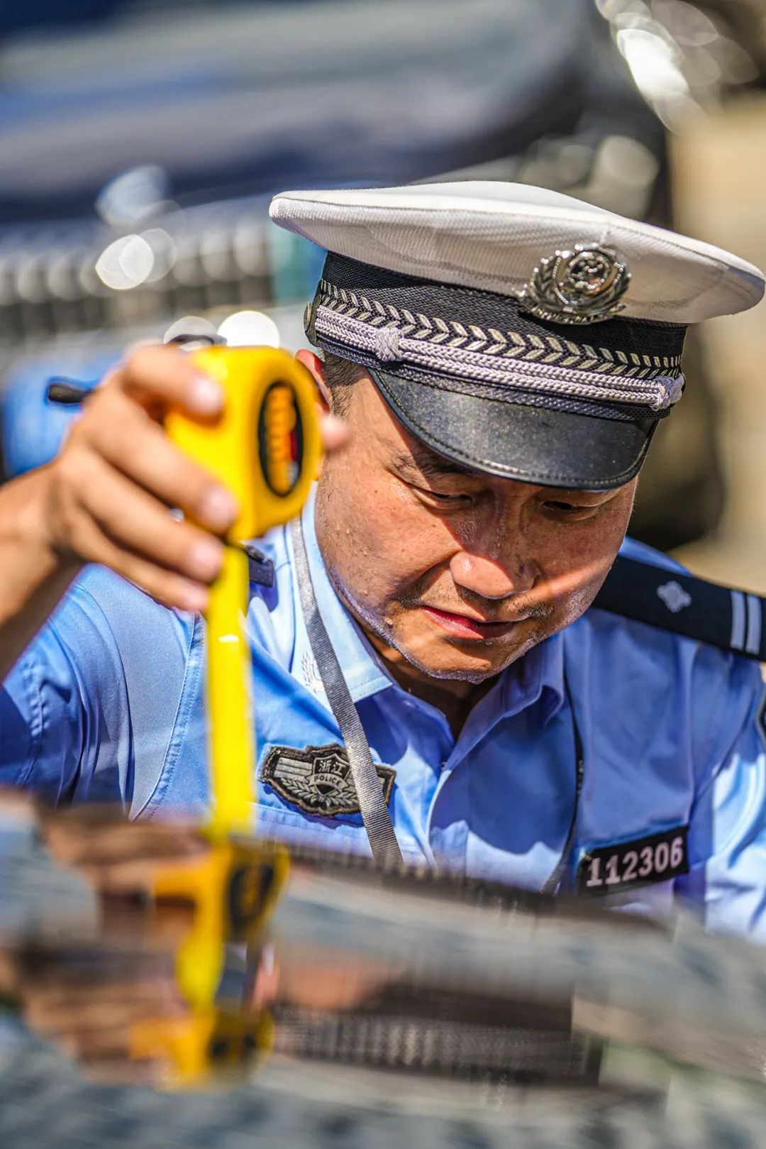 杭州交警西湖大隊民警蔣亮亮在事故現場(chǎng)開(kāi)展勘查工作。