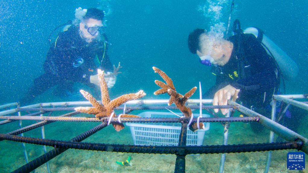 海南省海洋與漁業(yè)科學(xué)研究院的專(zhuān)家和分界洲島旅游區工作人員在海南省陵水黎族自治縣分界洲島附近海域移植珊瑚(2022年6月7日攝)。新華社記者 張麗蕓 攝