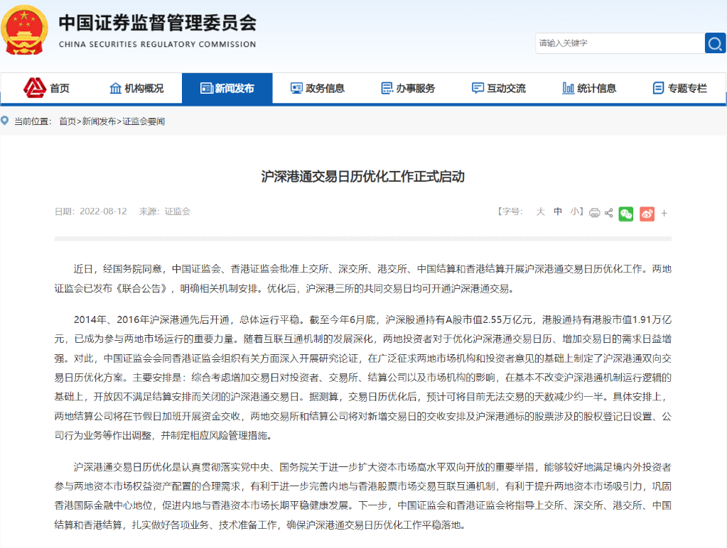 中國證監會(huì )8月12日表示,近日,經(jīng)國務(wù)院同意,中國證監會(huì )、香港證監會(huì )批準上交所、深交所、港交所、中國結算和香港結算開(kāi)展滬深港通交易日歷優(yōu)化工作。優(yōu)化后,滬深港三所的共同交易日均可開(kāi)通滬深港通交易。