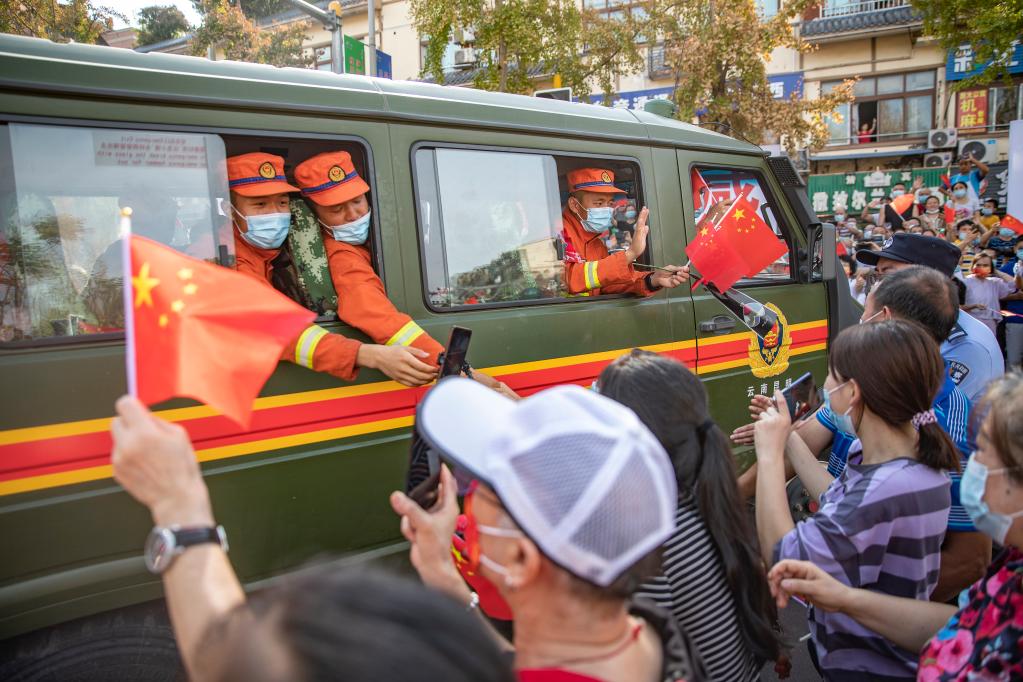 大家向消防隊員喊著(zhù),難掩激動(dòng)之情,不少人上前與他們握手,隊員們也揮手致意,一些人流下了激動(dòng)的淚水。
