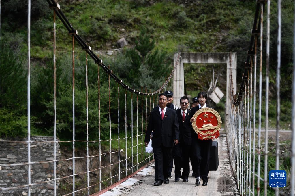 青海省果洛藏族自治州班瑪縣人民法院巡回法庭成員前往班瑪縣燈塔鄉班前村提供法律服務(wù)(2021年8月7日攝)。新華社記者 張龍 攝