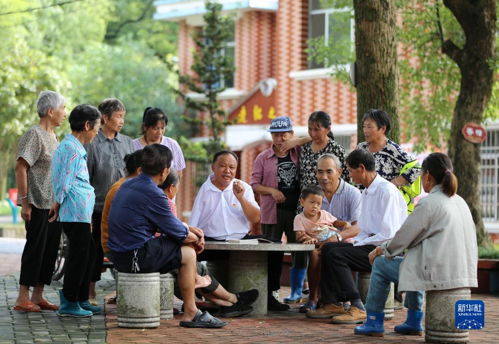 江西蘆溪縣宣風(fēng)鎮珠亭村人民調解員陽(yáng)昌紹(中)為珠亭村的百姓宣講民法典知識(2021年8月17日攝)。新華社記者 胡晨歡 攝