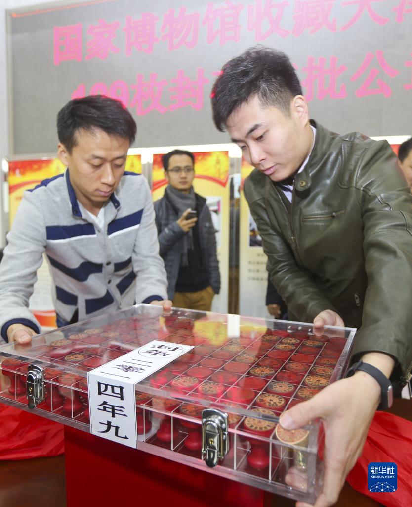 2014年11月15日,國家博物館工作人員搬走天津濱海新區109枚封存審批公章。新華社發(fā)(付文超 攝)