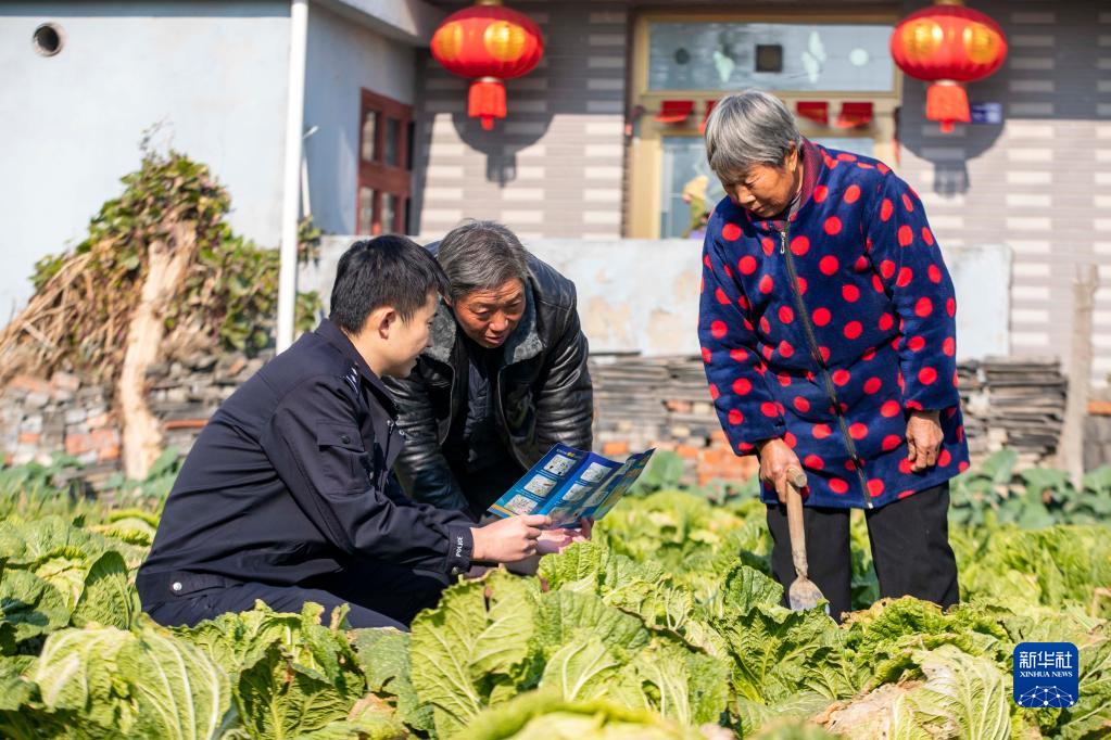 江蘇省泰州市海陵區蘇陳派出所民警在蘇陳社區田間地頭向農戶(hù)進(jìn)行普法宣傳(2021年12月4日攝)。新華社發(fā)(湯德宏 攝)