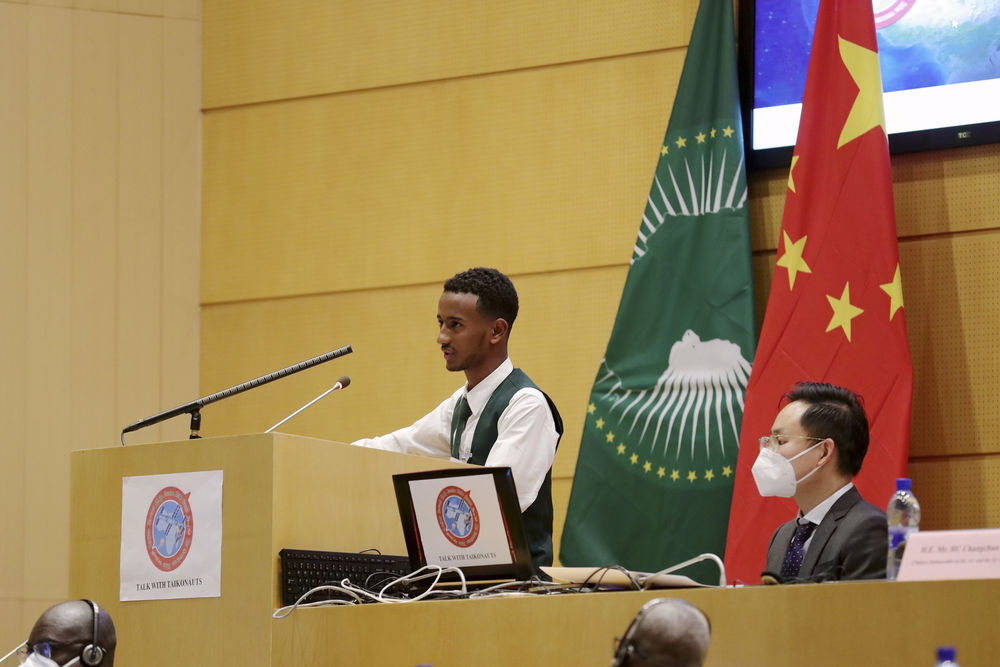 ↑9月6日,在位于埃塞俄比亞亞的斯亞貝巴的非盟總部,一名埃塞俄比亞中學(xué)生在“天宮對話(huà)”活動(dòng)中向中國航天員提問(wèn)。新華社發(fā)(邁克爾·特韋爾德攝)