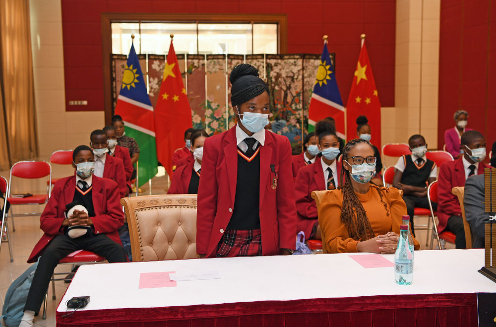 ↑9月6日,在納米比亞首都溫得和克的“天宮對話(huà)”活動(dòng)納米比亞分會(huì )場(chǎng),一名學(xué)生向中國航天員提問(wèn)。新華社記者 陳誠 攝