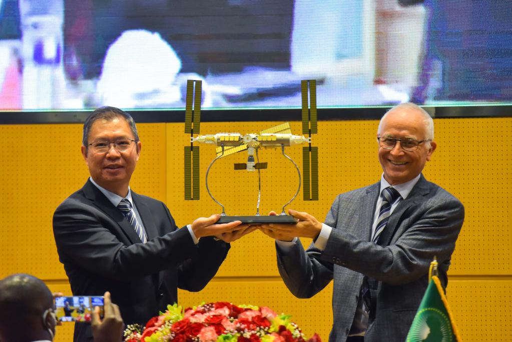 9月6日,在位于埃塞俄比亞亞的斯亞貝巴的非盟總部,中國駐非盟使團團長(cháng)胡長(cháng)春大使(左)向非盟委員會(huì )教育、科技與創(chuàng )新委員貝勒侯賽因贈送“天宮”空間站模型。新華社發(fā)(邁克爾·特韋爾德攝)