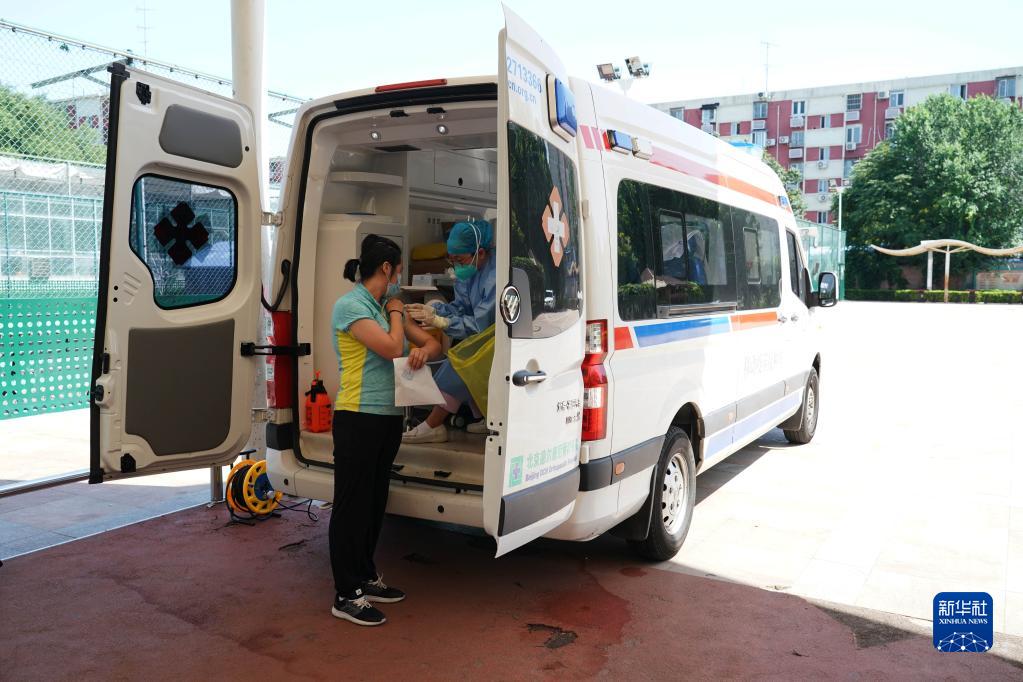2022年7月13日,在北京市海淀區北下關(guān)街道中國農業(yè)科學(xué)院社區新冠疫苗臨時(shí)接種點(diǎn),醫護人員在流動(dòng)疫苗接種車(chē)上為社區居民接種。新華社記者 任超 攝