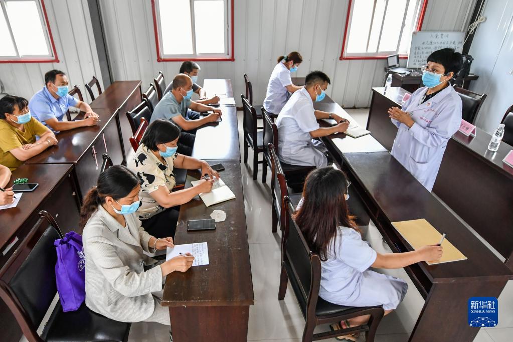 2022年7月6日,長(cháng)治醫學(xué)院和平醫療集團“第一村醫”壺關(guān)縣工作隊的醫生趙甘婷(右一)在為山西省長(cháng)治市壺關(guān)縣大峽谷鎮衛生院的村醫們上課。新華社記者 曹陽(yáng) 攝
