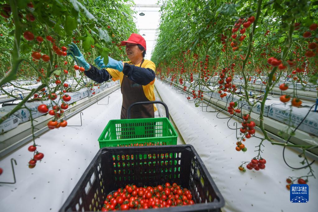 2022年5月31日,在浙江省嘉興市南湖區七星街道湘家蕩農業(yè)數字化工廠(chǎng)的數字化大棚內,農民在采摘立體栽培的番茄。新華社記者 徐昱 攝