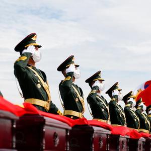 邁著(zhù)整齊劃一的步伐,英姿挺拔的中國人民解放軍禮兵將棺槨安放在事先準備好的長(cháng)桌上。中國駐韓國大使邢海明神情莊重、緩步上前,為棺槨覆蓋上鮮艷的五星紅旗,細心地將國旗整理?yè)崞?,并在每一具棺槨前深深鞠躬?/p>