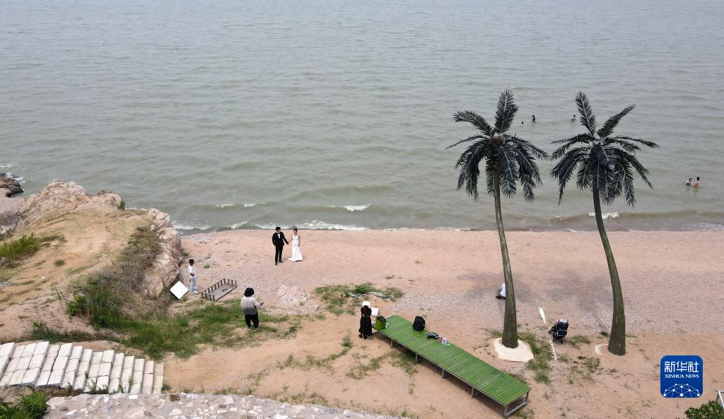2022年7月17日,市民在巢湖岸邊拍攝婚紗照(無(wú)人機照片)。