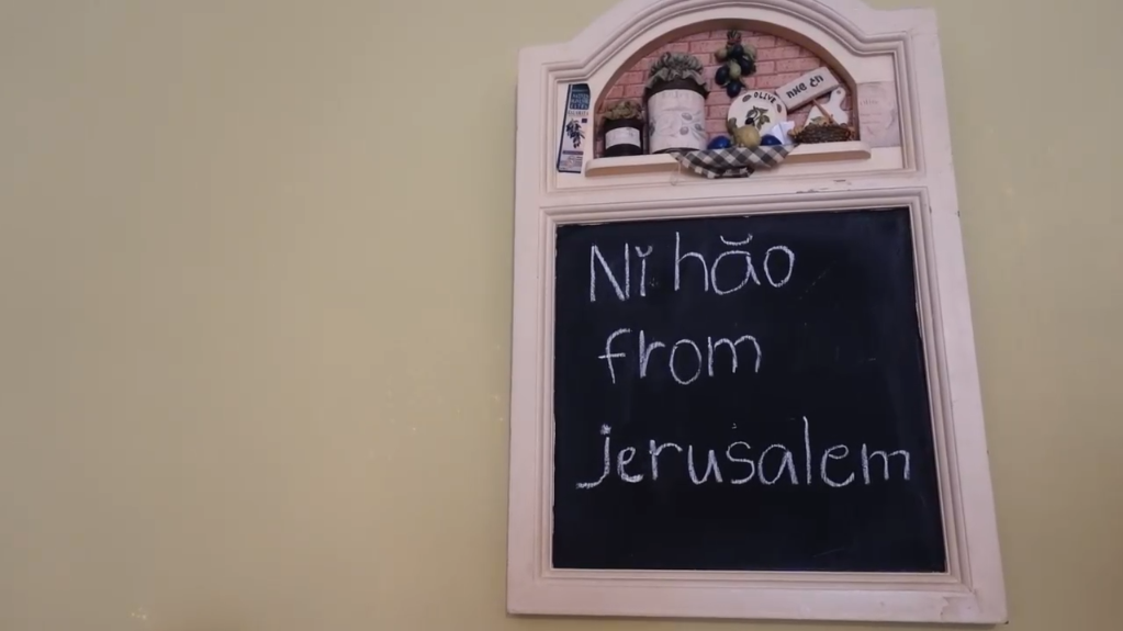 拉維家中寫(xiě)著(zhù)“你好,來(lái)自耶路撒冷”的小黑板。視頻截圖