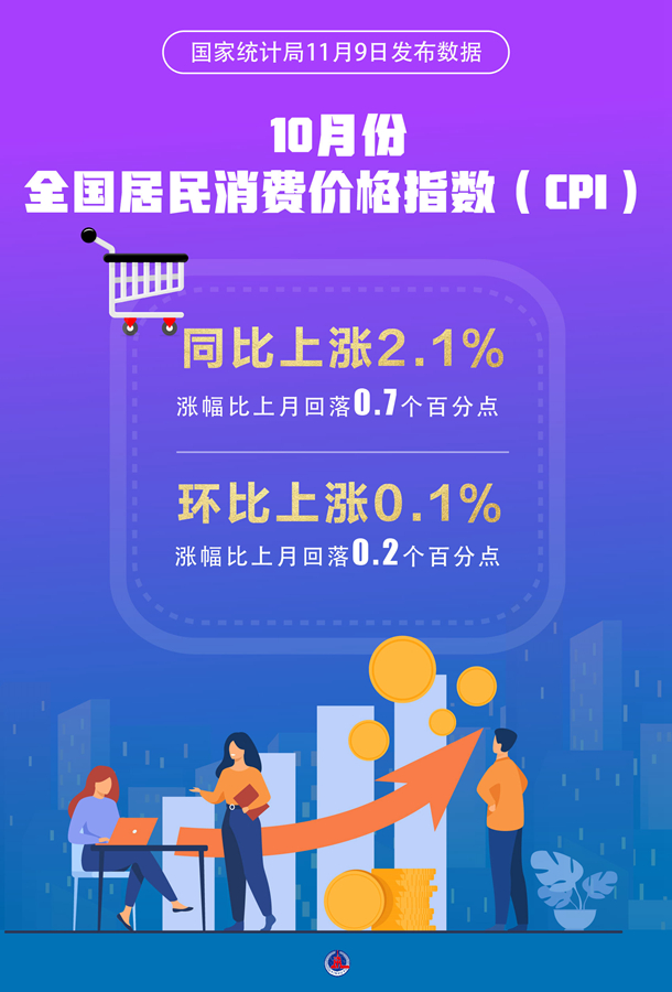 新華社北京11月9日電(記者魏玉坤)國家統計局9日發(fā)布數據,10月份,全國居民消費價(jià)格指數(CPI)同比上漲2.1%,漲幅比上月回落0.7個(gè)百分點(diǎn);環(huán)比上漲0.1%,漲幅比上月回落0.2個(gè)百分點(diǎn)。
