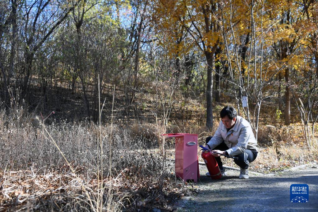在翠湖國家城市濕地公園,張庚檢查園中的消防設備(11月7日攝)。