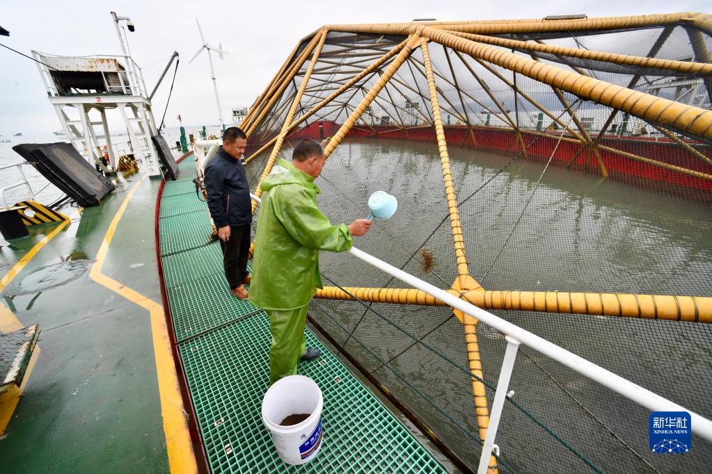 福建省連江縣定海灣內的“振漁1號”深遠海養殖平臺上,工作人員在為養殖大黃魚(yú)投喂飼料(11月15日攝)。