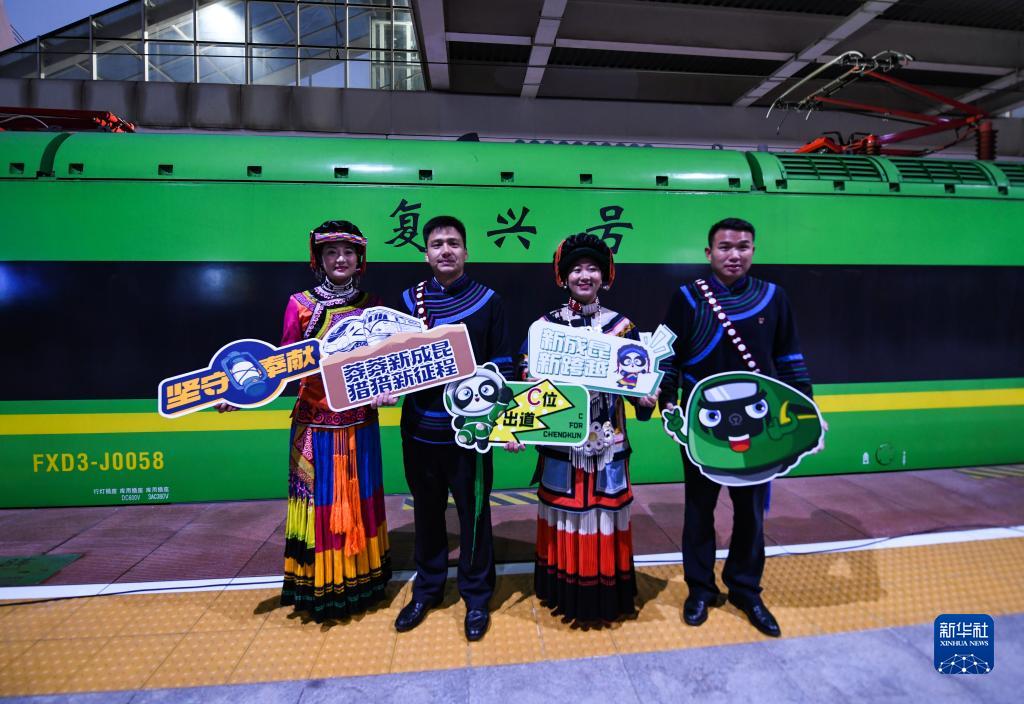 12月26日,在成都南站,彝族群眾在新成昆鐵路首發(fā)列車(chē)出發(fā)前合影留念。 新華社記者 王曦 攝