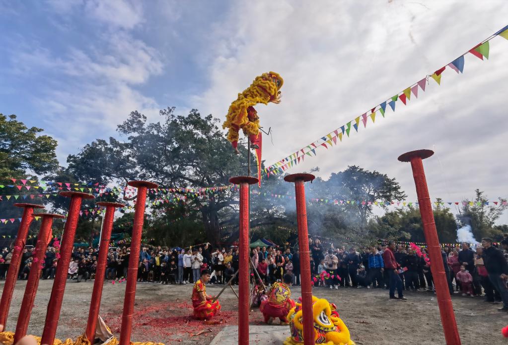 在廣西藤縣和平鎮白沙村400多年的古樹(shù)下,村里的老老小小聚在一起祈福迎春。舞獅人早早來(lái)到這里,威嚴的獅樁陣一字擺開(kāi),好奇的村民昂頭望向樁頂,想象著(zhù)這將會(huì )是一場(chǎng)多么精彩的舞獅表演。