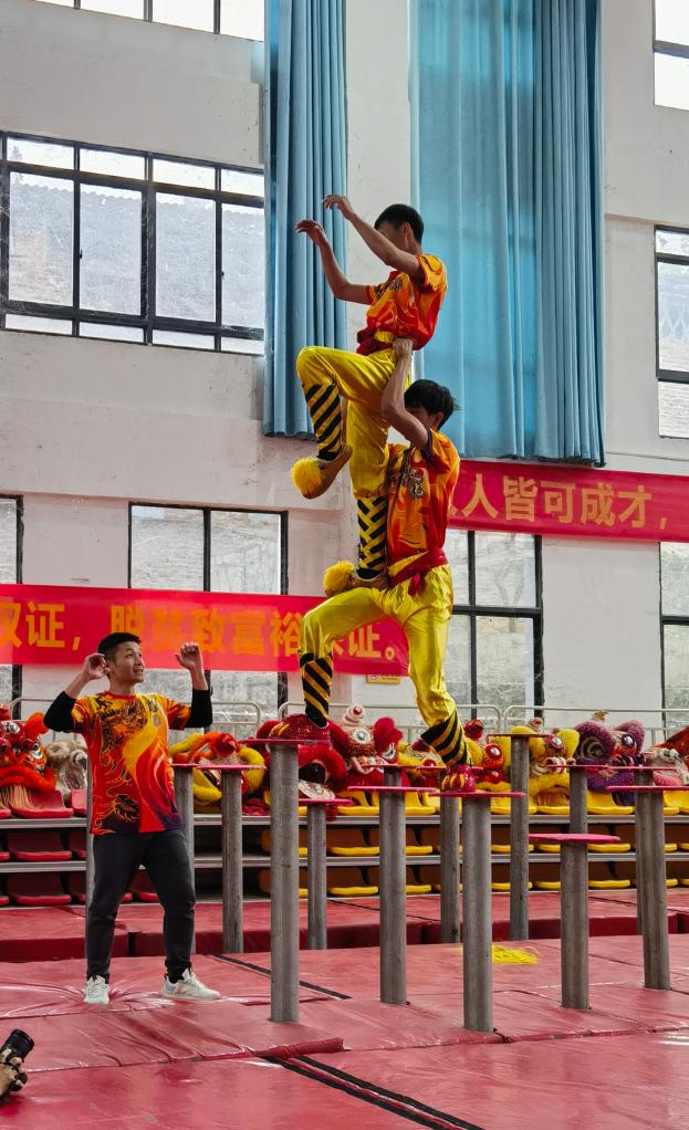 獅頭獅尾兩人默契配合、行云流水,在高樁上表演著(zhù)一系列高難度動(dòng)作:“金獅倒掛”“絕壁采靈芝”“探峰攀崖”“獨樁挾腰轉體450°絕技”……驚險刺激而又出神入化的表演,引得觀(guān)眾連連拍手叫絕:“原來(lái)高樁上還可以這樣舞獅!”