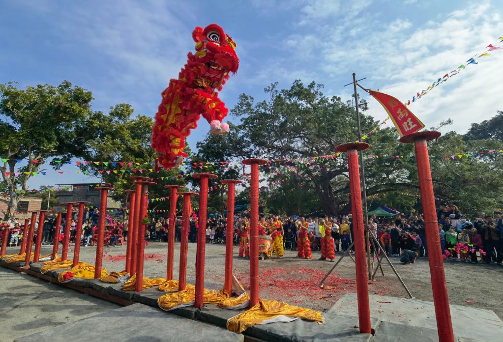 幾個(gè)歡天喜地的互動(dòng)節目過(guò)后,壓臺戲登場(chǎng)。由兩位舞獅人扮演的雄獅縱身一躍,跳上高聳的獅樁陣。這組高樁由21個(gè)樁柱組成,樁面直徑為38厘米,樁柱高在1.2米到2.5米之間,兩樁之間最大跨度為1.8米。