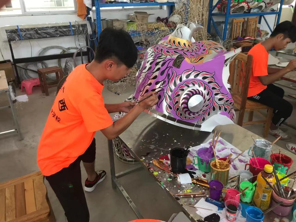 藤縣獅王文化傳播有限公司不僅派出教練全程負責舞獅班學(xué)生的專(zhuān)業(yè)課程,還出資建設龍獅扎作藝術(shù)館,傳授龍獅扎作技藝。