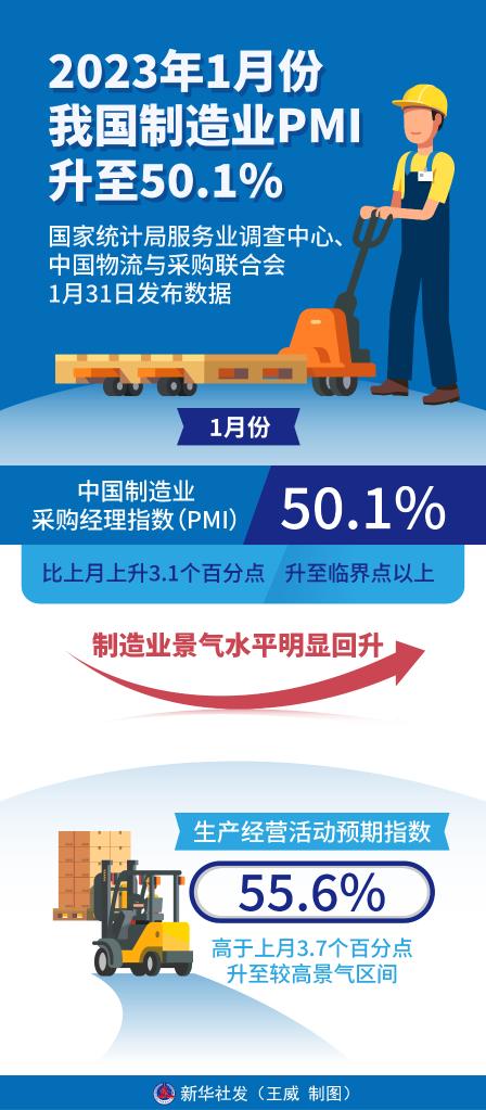 新華社北京1月31日電(記者魏玉坤、韓佳諾)國家統計局服務(wù)業(yè)調查中心、中國物流與采購聯(lián)合會(huì )1月31日發(fā)布數據,1月份,中國制造業(yè)采購經(jīng)理指數(PMI)為50.1%,比上月上升3.1個(gè)百分點(diǎn),升至臨界點(diǎn)以上,制造業(yè)景氣水平明顯回升。