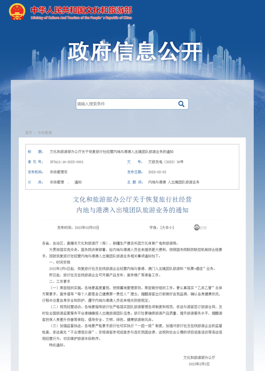 2023年2月6日起,恢復旅行社及在線(xiàn)旅游企業(yè)經(jīng)營(yíng)內地與香港、澳門(mén)入出境團隊旅游和“機票+酒店”業(yè)務(wù)。