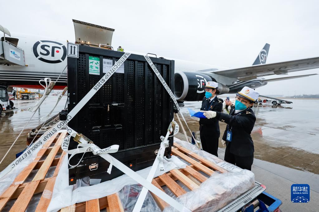 2月21日,在成都雙流國際機場(chǎng),海關(guān)工作人員在停機坪監卸大熊貓“香香”。新華社記者 沈伯韓 攝