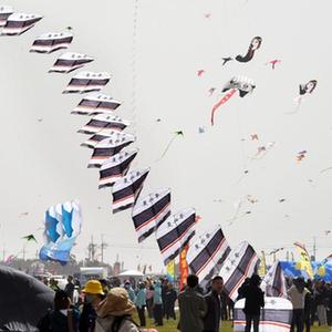 “大家一起用力拉繩!”在濰坊濱海風(fēng)箏放飛場(chǎng)一角,上海志華風(fēng)箏隊隊員們正齊心協(xié)力把一個(gè)巨型鯨魚(yú)風(fēng)箏放飛。這支由十幾名退休老人組成的風(fēng)箏隊已是第8次來(lái)到濰坊。他們把最好的作品帶到濰坊,包括一只鋪展面積達350多平方米的三葉蟲(chóng)造型風(fēng)箏。