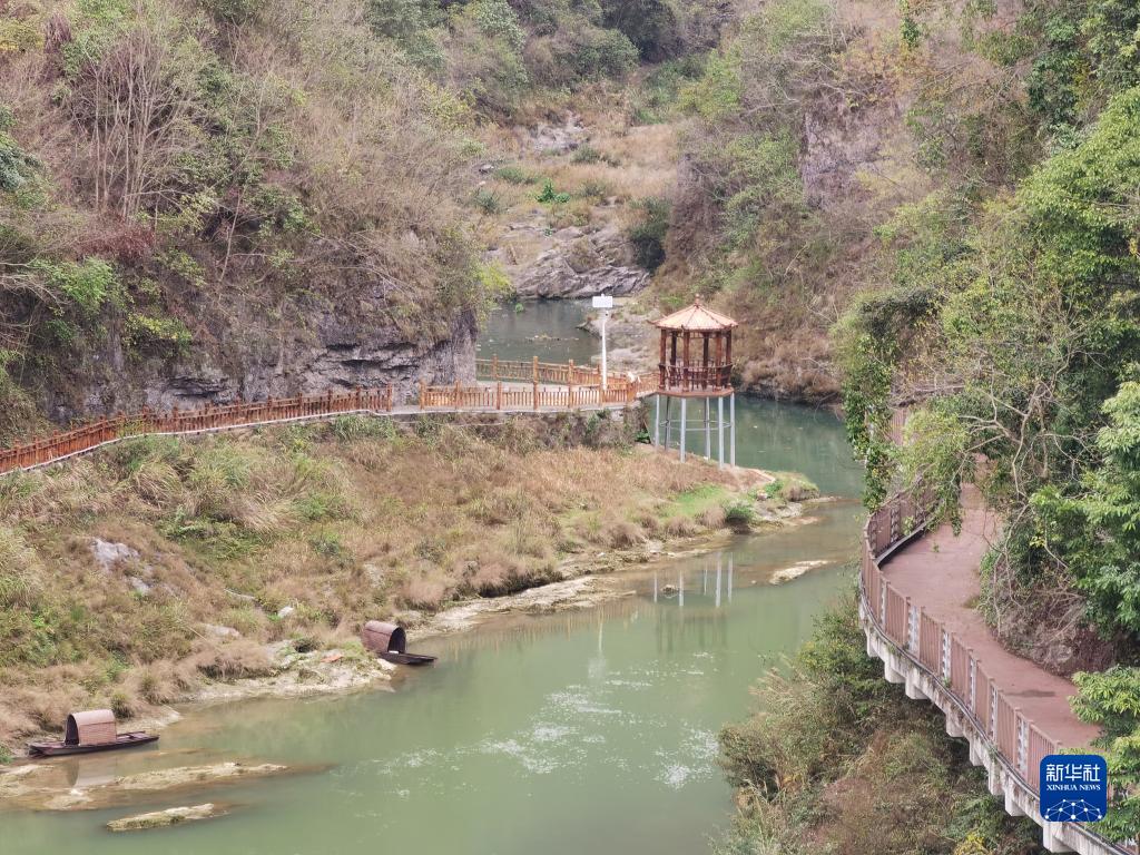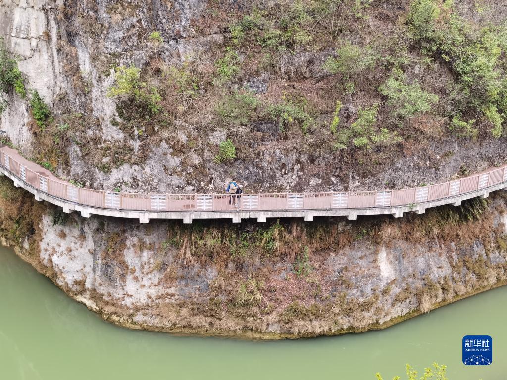 游客在正在升級改造的貴州省開(kāi)陽(yáng)縣香火巖瀑布景區內逗留(2023年3月18日攝,手機照片)。新華社記者 向定杰 攝