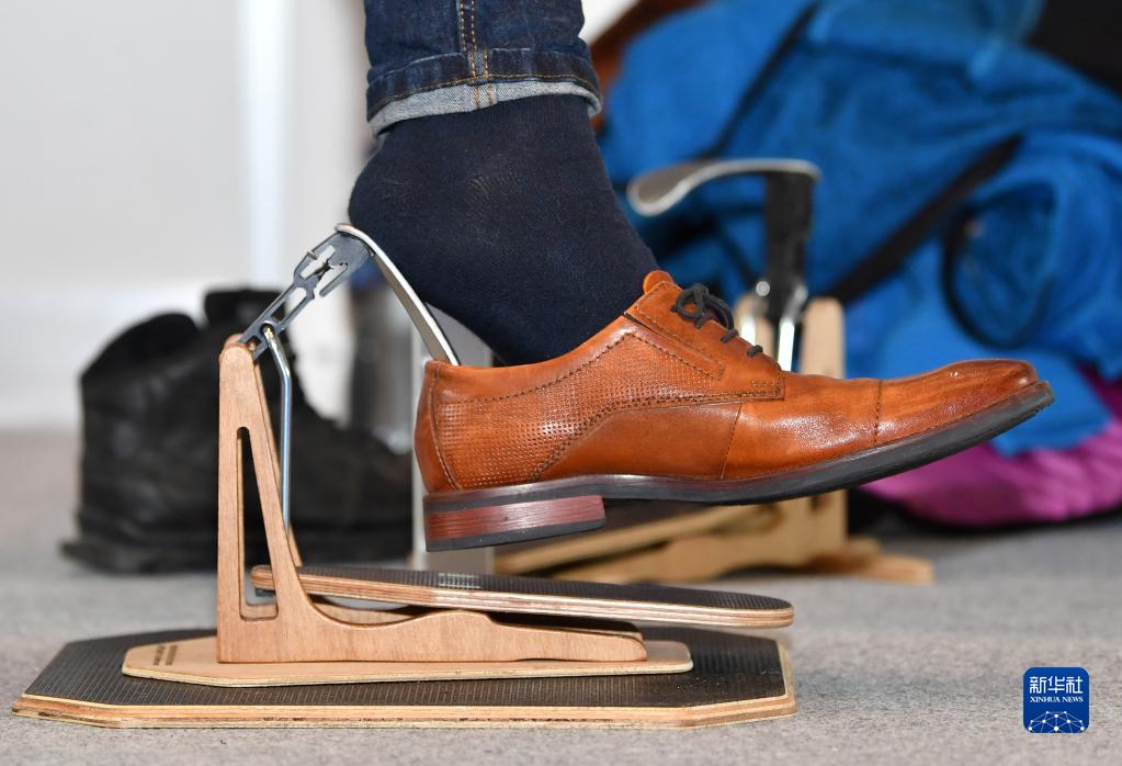 這是4月26日在瑞士日內瓦舉行的第48屆日內瓦國際發(fā)明展上拍攝的一款穿鞋器。新華社記者 連漪 攝