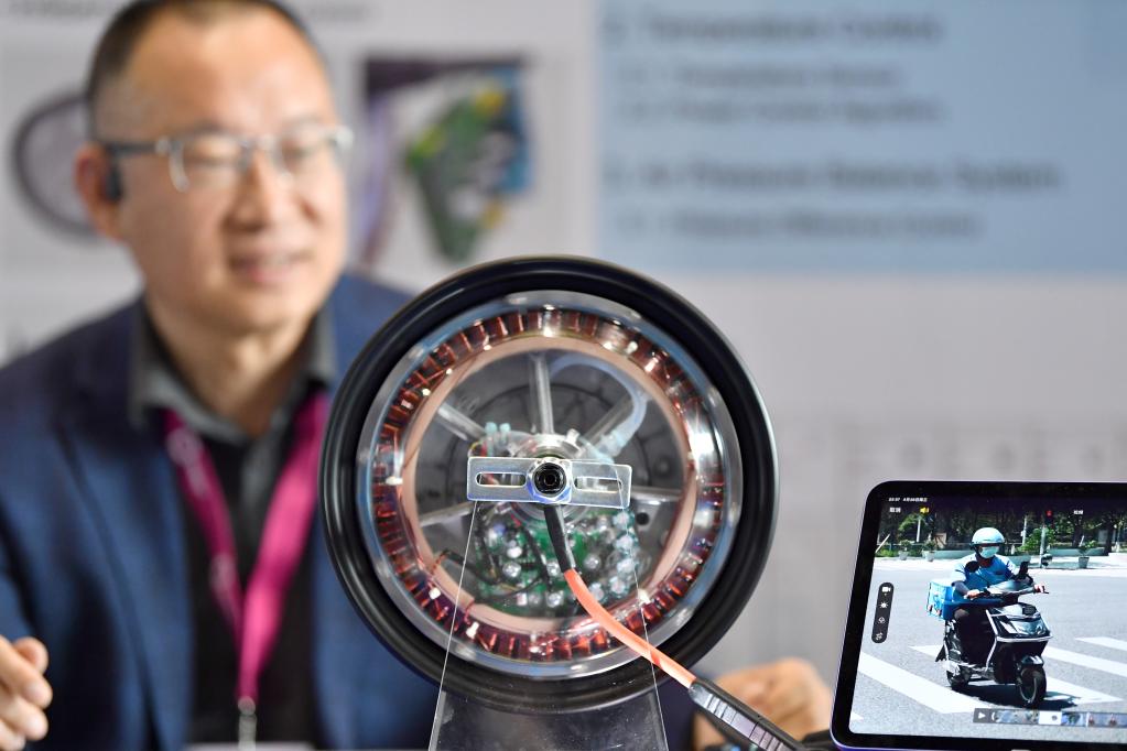 4月26日,在瑞士日內瓦,一名來(lái)自中國的發(fā)明家在第48屆日內瓦國際發(fā)明展上展示一款電驅系統。新華社記者連漪攝