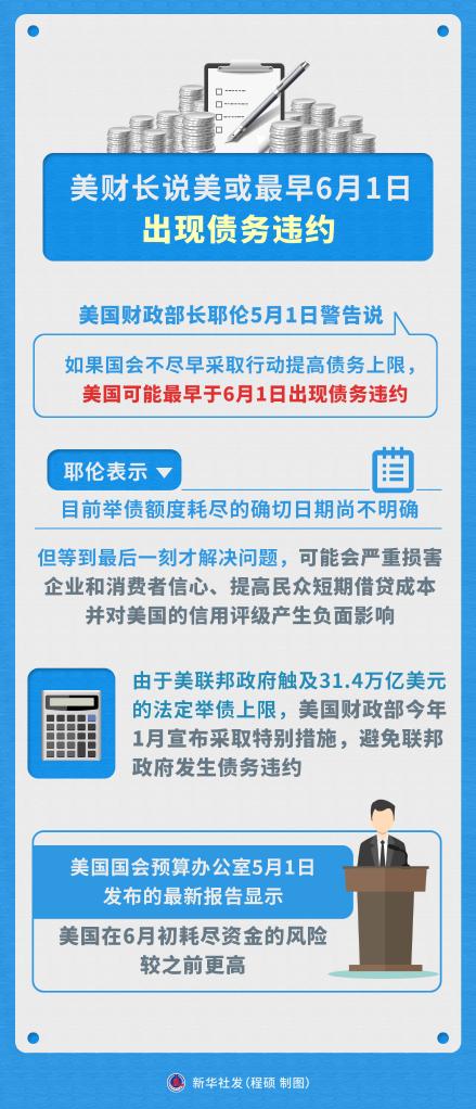美國財政部長(cháng)耶倫5月1日向美國國會(huì )發(fā)出警告:按照當前美國政府舉債的速度,美國可能最早在6月1日觸及現行法定債務(wù)上限,如果國會(huì )不抓緊通過(guò)立法提高債務(wù)上限,美國屆時(shí)將再次陷入債務(wù)違約困境。